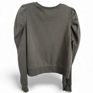 Cozy and feminine Rebecca Minkoff puff-sleeve sweatshirt in a dark charcoal/olive-gray tone. Features soft fleece interior, gathered puff shoulders, ribbed trim, and a classic crewneck. Perfect for casual wear, work-from-home outfits, or elevated athleisure looks.