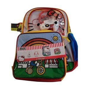 Backpack Features: Top zip; adjustable shoulder straps; one main compartment; one front zip pocket; two side foam mesh pockets; one inner padded laptop pocket; dimensions: 17" H x 12" W x 5" D; approx. 4" drop length; inside printed ID tag; ball chain; water proof base; Hello Kitty graphics