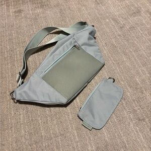 Oversized fanny pack in mint green. Includes matching small flat pouch. Like new