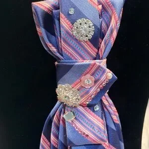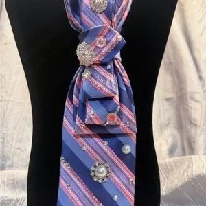 Add a touch of elegance to your outfit with this beautifully designed tie. Featuring a stunning combination of blue and pink stripes, this accessory is adorned with sparkling brooches for a glamorous finish with a peral necklace . Perfect for any occasion.
