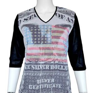 sick opaque lined mesh top with american money print & sheer mesh sleeves. big jpg vibes. true vintage made in usa