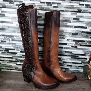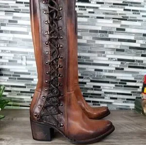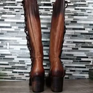 Step out in style with these unique Freebirds Chocolate brown leather knee-high boots, inside full Brass zipper & hardware. Outer Leather full Lace. Perfect for any occasion, these boots offer both character and sophistication.