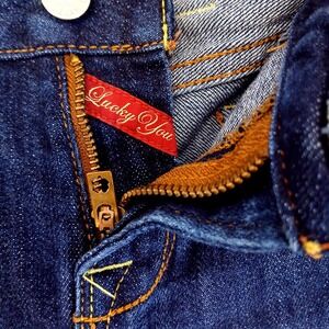 Details: Five-pocket design, zip fly with button closure, belt loops, leather logo patch, and "Lucky You" script inside the fly.