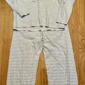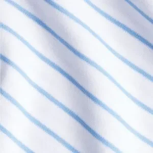 The Pima Crew Long-Long Set in Baltic Blue, cornflower blue stripes set on white, features a fitted, long-sleeve crewneck top. The pants are high-waisted with an elastic waist and straight-edge hem. Made from 100% Pima Cotton.