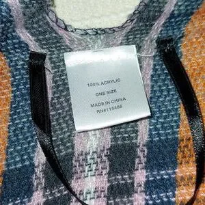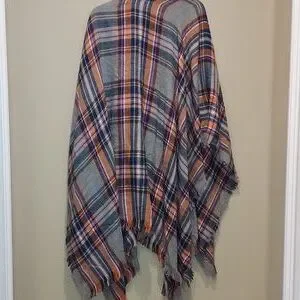 Size 53" W X 68" L Total length. Multicolored plaid. Burnt orange, grey, white, black, pink. Frayed hems. Excellent condition. Like new. Square. Great gift idea. Super soft. Lightweight.