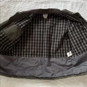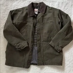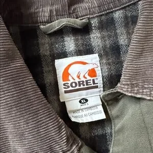 Stylish brown chore jacket with multiple pockets. Perfect for casual wear. This jacket is in a dark olive green and is lined in a soft wool flannel interior. The chore jacket has multiple pockets on the exterior and two at the interior, one being a zippered security pocket. Sturdy cotton canvas, and only shows minor signs of wear. No staining or tears. Brown corduroy collar. The sleeves are not lined in the wool, but in a polyester. Pit to pit measures approximately 27 inches. Total length measures approximately 32 inches. buttons up the front with metal Sorell logo buttons, and there are buttons at the cuffs.