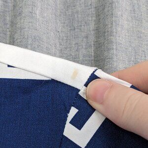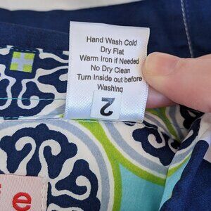 Shirt has a blue and white striped / Mediterranean pattern. The cuffs have a contrasting print on the inside and it looks like they're supposed to be worn with the cuffs rolled up. There are sewn darts on both the front and the back. Fabric is stiffer than a t-shirt. 95% cotton, 5% lycra.