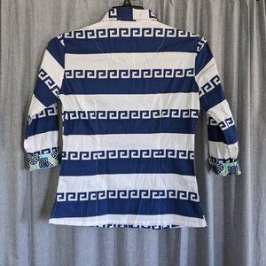 Tizzie Button Down Top Womens S Blue White Geometric Print 3/4 Sleeve Vacation