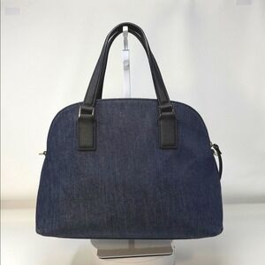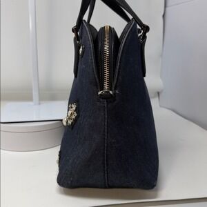Adorn your ensemble with this captivating Kate Spade denim satchel, a true statement piece that blends casual charm with dazzling elegance. Intricate floral embellishments, featuring lustrous pearls and sparkling crystals, bloom across the rich denim canvas, each bloom meticulously crafted to catch the light. Contrasting black leather straps provide a sophisticated touch and comfortable carrying options, while the structured silhouette ensures timeless appeal. Perfect for adding a touch of glamour to your daytime adventures or elevating your evening out.