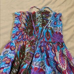 Colorful top with a mix of blue, purple, and red feather patterns. Made from 100% cotton for comfort. Has tie to tie around neck, or could be worn strapless. Fits one size, has plenty of stretch to it.