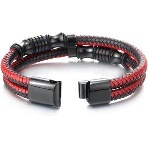 Features: This bracelet features a double-row braided design in striking red and black leather, accented with sleek stainless steel details for a modern, edgy vibe. It’s versatile—great for casual days or dressing up a bit for a night out. Built with high-quality materials for durability and all-day comfort.