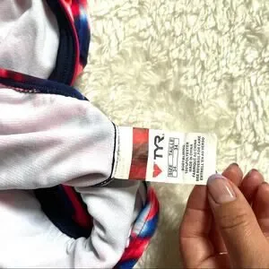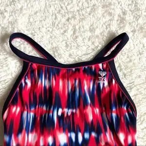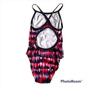 TYR Durafast Women’s One Piece Swimming Suit Racer Back Size 34 Red Navy Tie-Dye