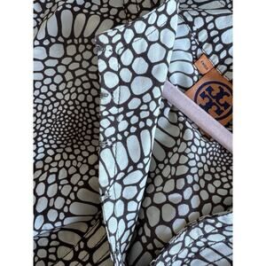 The Tory Burch silk tunic top in brown is a designer piece perfect for the summer, fall, and spring seasons. This blouse features a regular fit for women and a size 6, with a luxurious silk material that adds elegance to any outfit. The tunic style and Tory Burch branding make it a fashionable choice for those looking for high-quality women's clothing. has a stain on back of sleeve unsure if it can be removed.