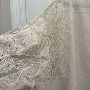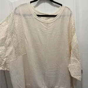 Super Soft, cream shirt with 3/4 lace sleeves. Comfortable and stylish. Is a little fuzzy and does show some pilling. Has a lightly banded bottom giving the oversized top additional shape. Sleeves are beautiful crochet lace.