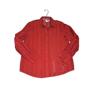 A stylish Chico's rust orange button-up shirt featuring an intricate sheer chevron poplin cutwork fabric. This top offers a sophisticated and textured look with full-length sleeves and a classic collar. Perfect for layering or as a statement piece for evening events or a chic daytime ensemble.