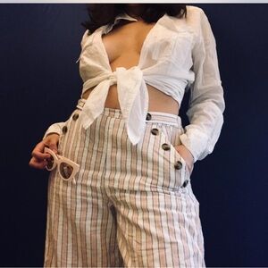 Stylish wide-leg pants with vertical stripes. Features button details on the waist. Perfect for casual wear.