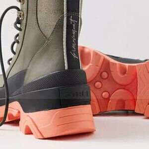 Stylish lace-up boots by Sorel with Free People. Olive green upper with orange sole. Durable and trendy waterproof design.