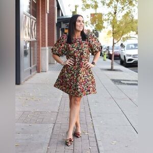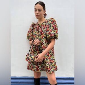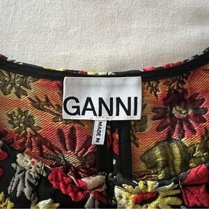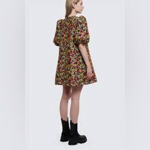 Gorgeous "3D Jacquard A-Line Mini" dress in a floral print with subtle "Ganni" logos on the leaves ("Meadow Black"). Gorgeous signature puff sleeves!
