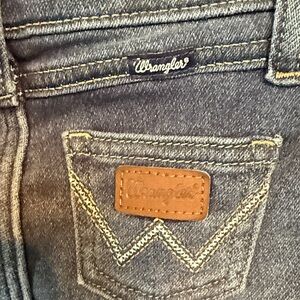 Classic Wrangler jeans in denim blue. Features stylish back pockets. Ideal for playtime.