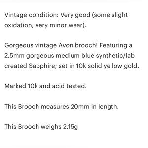 Gorgeous vintage Avon brooch! Featuring a 2.5mm gorgeous medium blue synthetic/lab created Sapphire; set in 10k solid yellow gold.