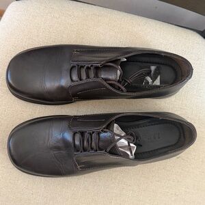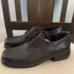 LL Bean Women’s Vintage Leather Heeled Loafers in Dark Brown. Lace Up. Heels measure approximately 1 inch high. In good condition as shown in photos. There is some sticker residue on one insole as shown. Size Women’s 9.