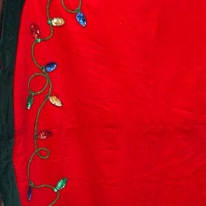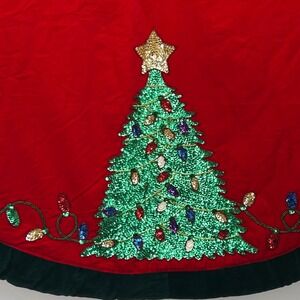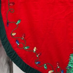 Keywords: Christmas, Holiday, Tree Skirt, Red, Velvet, Sequin, Lights, Tree, Ornament, Star, Green Trim, Festive, Winter, Seasonal