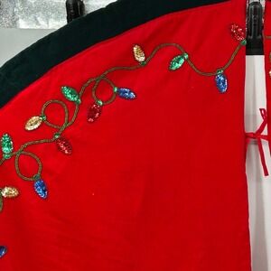 A festive red Christmas tree skirt adorned with a sparkling sequin string of colorful lights and a golden star-topped Christmas tree applique. This circular skirt features a plush dark green velvet trim and a convenient opening with red ties for easy placement around your tree stand. A white panel with red ribbon ties is integrated at the center opening, providing a clean finish.