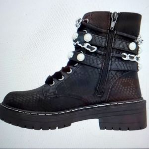 Pearl chains an edgy feminine feel to these cool combat boots from sugar. Size 8.