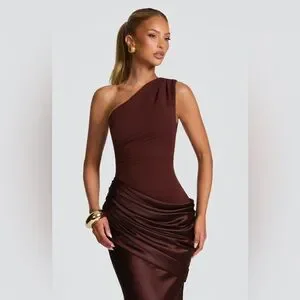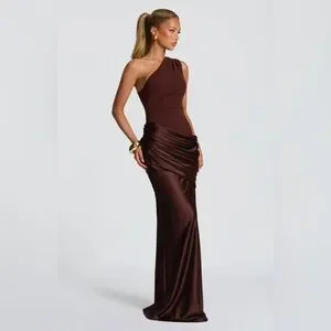 This elegant one-shoulder dress features a rich brown color, perfect for any formal occasion. The sleek design and luxurious fabric make it a standout piece in any wardrobe.