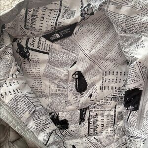 Light gray puffer jacket by The North Face. Quilted design for warmth. Perfect for outdoor adventures.