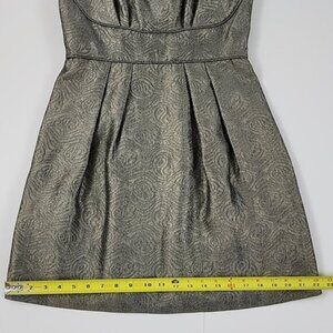 Excellent pre-owned condition, BCBGMAXAZRIA women's cocktail strapless bustier dress with pleated detailing, back zipper, cinched empire cit and in a rich metallic jacquard fabric, size 8.