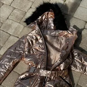 Shiny metallic snowsuit with a hood. Features black accents and a cozy design.