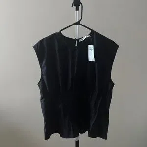 Chic black sleeveless blouse. Versatile and stylish. Ideal for layering or wearing alone. Cinched waist to create silhouette. Never worn, new with tags