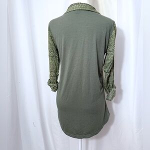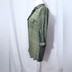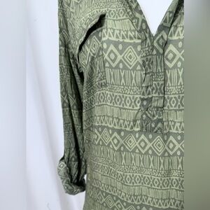Poof Green Long Sleeve Collared V-Neck Tunic Dress With Aztec Print Stripes