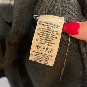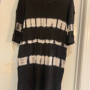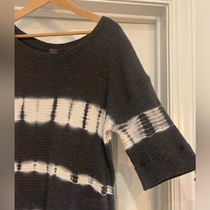 Stylish crew neck sweater. Features black and white tie-dye pattern. Comfortable and trendy.