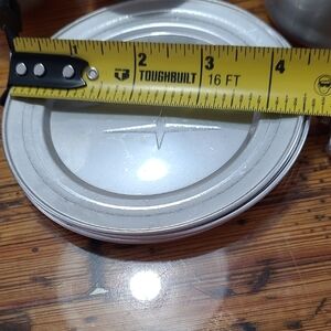 Vintage Childs silver coffee set with 5 cups black accents, 4 plates, one cat cookie cutter a d a biscuit cutter perfect for any play kitchen. Enhance your play time with this cute set. Has a vintage tea pot that the silver is coming off has a tray for the pot. Has 3 1950's STANHOME CASTERS.
