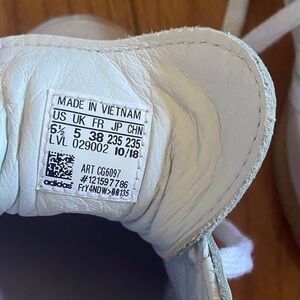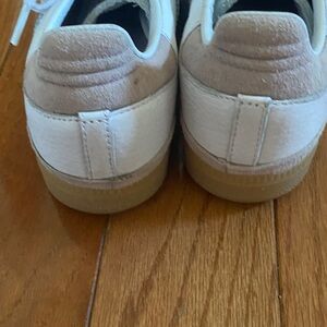 Classic Adidas Samba sneakers in white with lavender accents. I bought these around 2015 and never wore. Condition is good except for some fading on the lavender suave accents, fading on interior foot bed, and marks on toes as pictured. Otherwise great condition.