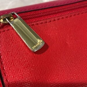 Vibrant pop of color… COACH color block long line wallet snap closure 8 card compartments leather exterior zip compartment 2 interior slip pockets normal wear such as marks scratches fading gold logo coin residue but in very good preloved preowned condition
