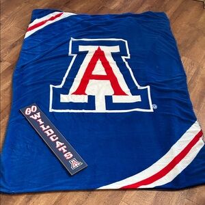 Cozy blue blanket featuring the University of Arizona Wildcats logo. Perfect for fans. Includes “GO WILDCATS” wooden sign. Approximate measurements of blanket are 50 X 72. Approximate measurements of sign is 4 1/2 wide and length is 24