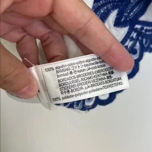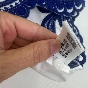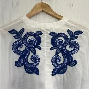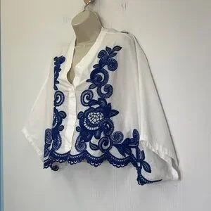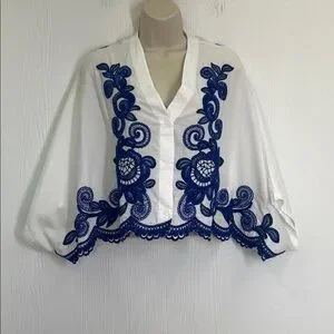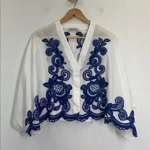 Zara - Blue Embroidered Floral White Button Down Batwing Blouse Size XS