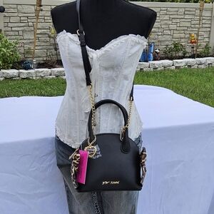 Stylish black satchel with leopard print sides. Features gold chain accents. Perfect for any occasion.