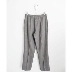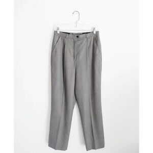 Escada Grey Lightweight Wool Pleated Trousers DE 38 US 8, a few faint splatter marks, high rise, front zip, pleat front, slant seam hip pockets, slightly tapered leg, brown black and white for overall grey effect lightweight twill? woven self--has the diagonal pattern of a twill but is so thin and lightweight that the texture isn't discernible, is very breathable, 100% pure new wool, 14-14.5" across waist, 12.5" front rise, ~19.25" across hips 20.75" with pleats pulled out, 12.5" across thigh, 28" inseam, 16.5" leg opening