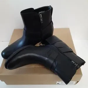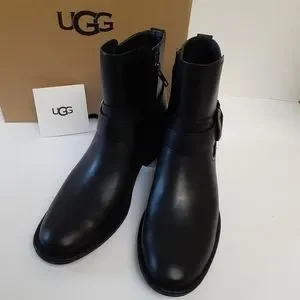 Brand new in box, UGG Atwood Boots in Black. Sz 9.5. Impeccably cut from smooth leather with a stacked heel and buckled strap details, this boot has easy sophistication down pat. Wear with jeans and a blazer, or any of your Americana favorites.