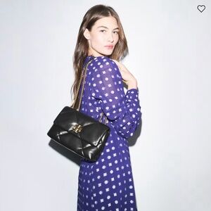 Sleek black quilted design. Features a stylish gold chain strap. Perfect for versatile wear.