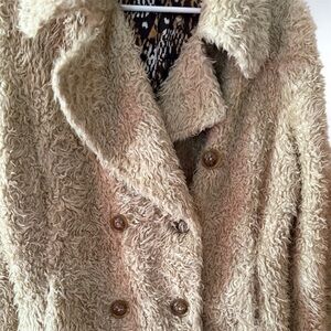 Pre-owned Anne Klein fuzzy peacoat, size M. This stylish jacket features a double-breasted design and a soft, teddy bear texture in a neutral beige/cream color. It is in excellent second-hand condition with a unique animal print lining. Perfect for adding a cozy, chic layer to any outfit.