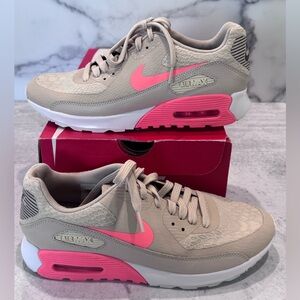 Nike Air Max 90 Ultra 2.0. Oatmeal, Lava Glow and White. Ideal for everyday style. Black smudge on toe (see pic), otherwise it’s in great condition.