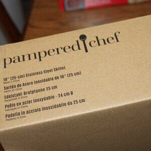 Pampered Chef 10-inch covered stainless steel skillet, new in package, 2 1/4-quart capacity, heat safe stovetop or oven, dishwasher safe.