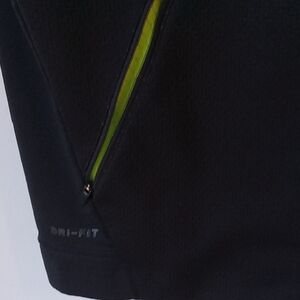 Nike Dri-Fit Men's Black warm Sleeveless Vest, size M. Stay stylish and comfortable with the Nike Men's Black Sleeveless vest, lime green lining. Perfect for layering, this vest features a sleek black design with subtle branding. Zipper front, side zippered pockets. Measures 21" pit2pit, 27" length. Machine washable cold water, 100% polyester. Some stains on inside pocket, pictured, may wash out. activewear, style, classic brand, jacket, nostalgic