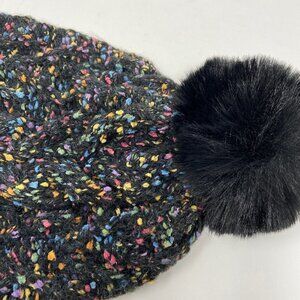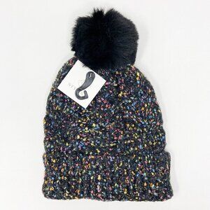 Confetti Cable Knit Pom Pom Beanie Stocking Cap Black