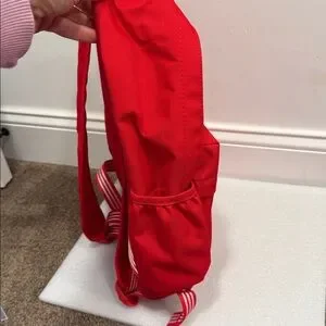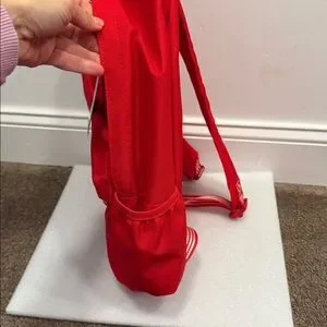 This is a full size adidas red backpack. It is brand new with the tags and has 2 pockets in the front and a pocket on either side for drinks. It measures 17” x 15” x 5”.